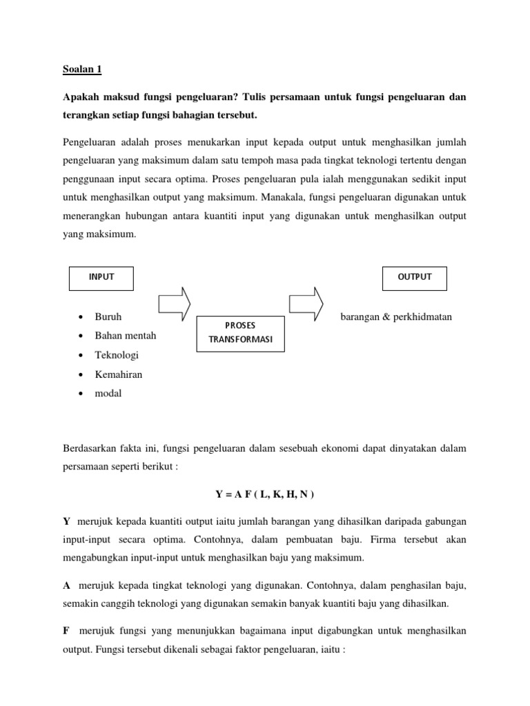 Pendapat lain dari para ahli adalah sebagai berikut. Pengeluaran ialah suatu fungsi perniagaan yg mengubah input kpd output sama ada dlm. Proses transformasi atau pengeluaran ialah proses menukarkaninput kepada output.